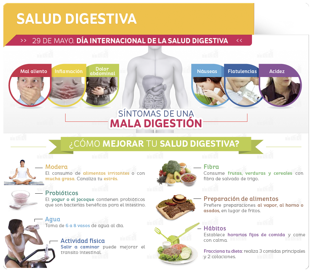 Ejemplo: Los sintomas de mala digestión son Abdomen inflamado, dolor abdominal, sensación de evacuación, etc. Ver más en el infograma aquí